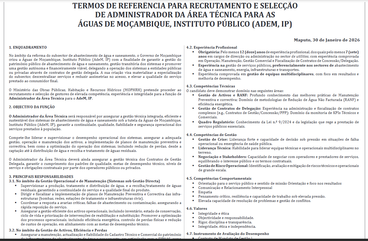 O Ministerio das Obras Publicas, Habitacao e Recursos Hidricos (MOPHRH) pretende proceder ao recrutamento e seleccao de gestores de elevada competencia, experiencia e integridade para a funcao de Administrador da Area Tecnica para o AdeM, IP.