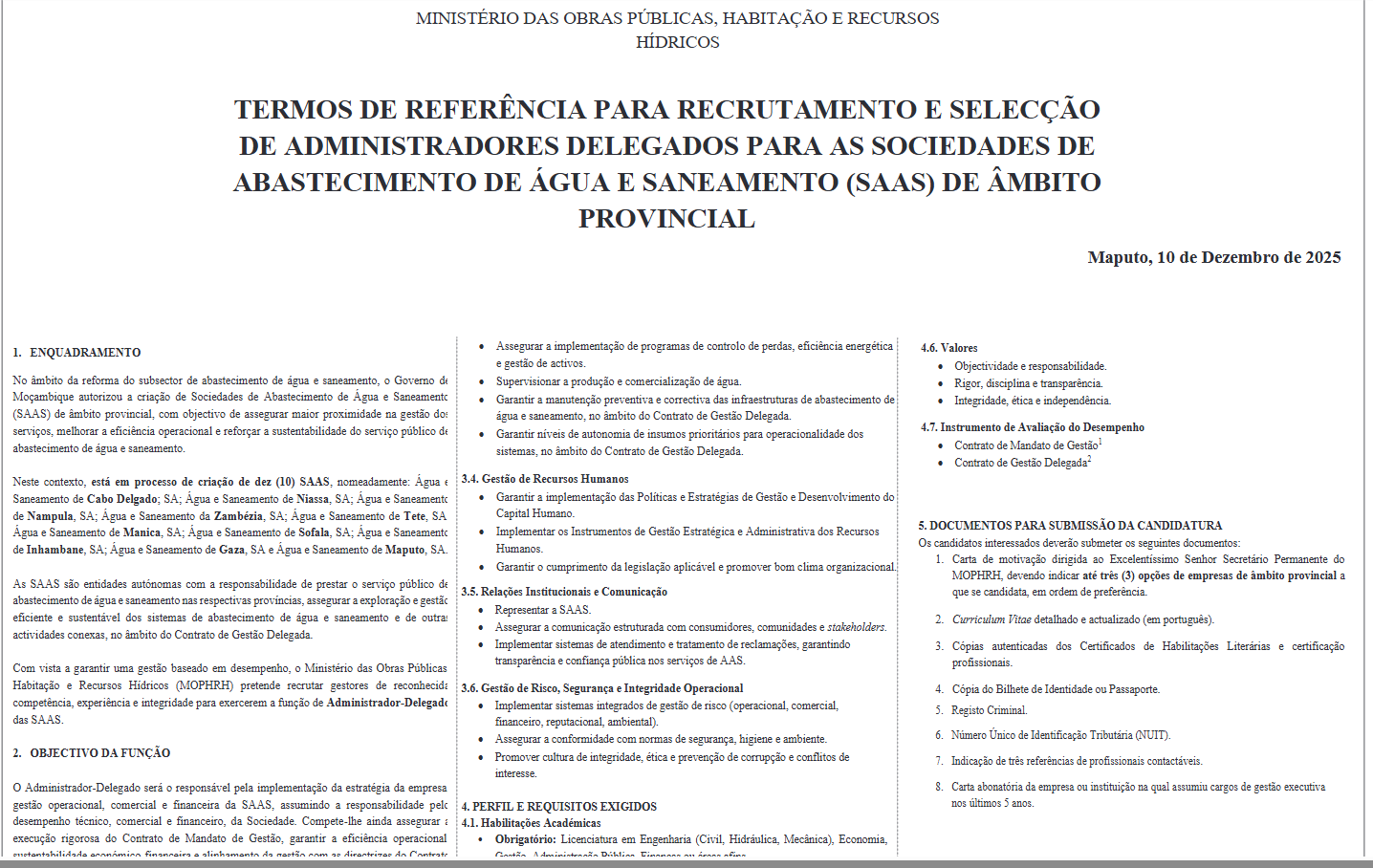 Com vista a garantir uma gestão baseado em desempenho, o Ministério das Obras Públicas Habitação e Recursos Hídricos (MOPHRH) pretende recrutar gestores de reconhecida competência, experiência e integridade para exercerem a função de Administrador-delegado das SAAS.