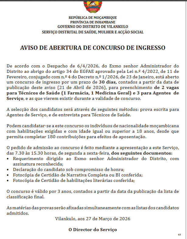 De acordo com o Despacho de 6/4/2026, do Exmo senhor Administrador do Distrito ao abrigo do artigo 34 do EGFAE aprovado pela Lei n.º 4/2022, de 11 de Fevereiro, conjugado com n.º 4 do Decreto n.º 1/2026, de 23 de Janeiro, está aberto um concurso de ingresso por um prazo de 30 dias, contados a partir da data de publicação deste aviso (21 de Abril de 2026), para preenchimento de 2 vagas para Técnicos de Saúde (1 Farmácia, 1 Medicina Geral) e 3 para Agentes de Serviço, e as que vierem existir durante a validade de concurso.