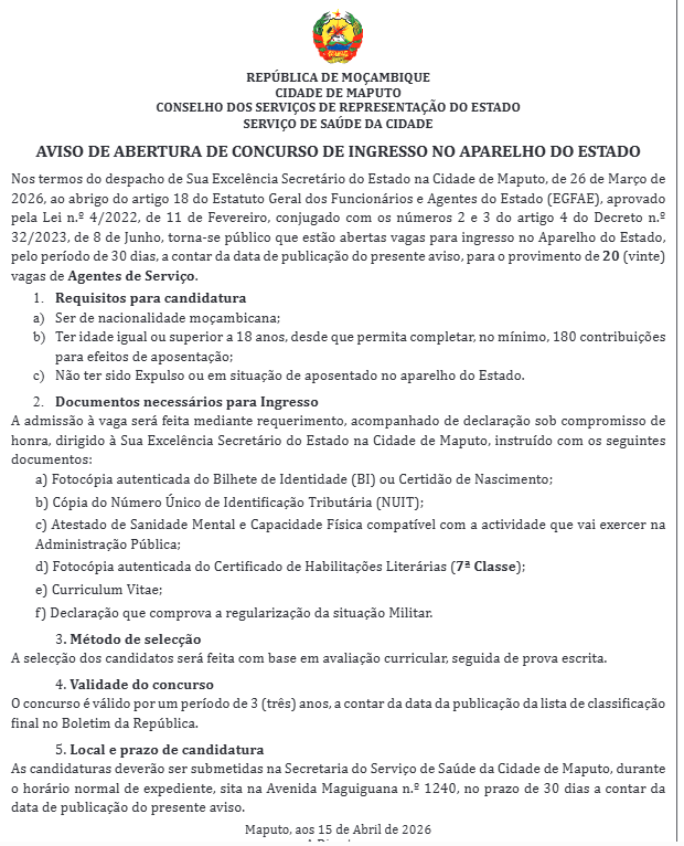 Nos termos do despacho de Sua Excelência Secretario do Estado na Cidade de Maputo, de 26 de Marco de 2026, ao abrigo do artigo 18 do Estatuto Geral dos Funcionários e Agentes do Estado (EGFAE), aprovado pela Lei n.º 4/2022, de 11 de Fevereiro, conjugado com os números 2 e 3 do artigo 4 do Decreto n.º 32/2023, de 8 de Junho, torna-se publico que estao abertas vagas para ingresso no Aparelho do Estado, pelo período de 30 dias, a contar da data de publicação do presente aviso, para o provimento de 20 (vinte) vagas de Agentes de Serviço.