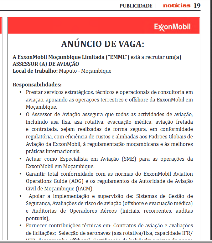 A ExxonMobil Moçambique Limitada (“EMMI”) esta a recrutar um(a) ASSESSOR (A) DE AVIAÇÃO