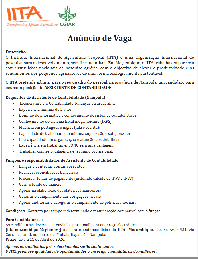 O IITA pretende admitir para o seu quadro do pessoal, na província de Nampula, um candidato para ocupar a posição de ASSISTENTE DE CONTABILIDADE.