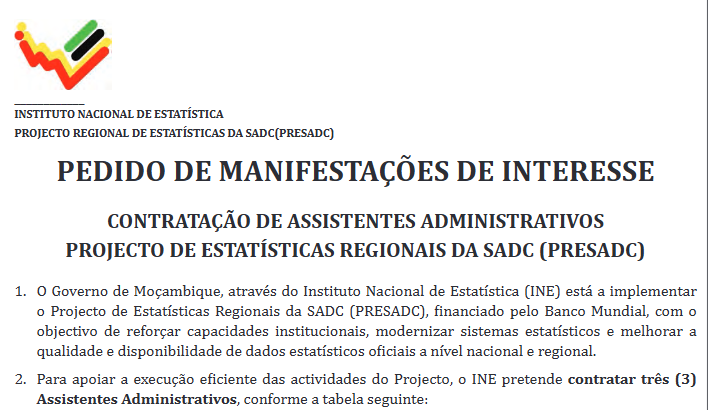 - Para apoiar a execução eficiente das actividades do Projecto, o INE pretende contratar três (3) Assistentes Administrativos, conforme a tabela seguinte:
