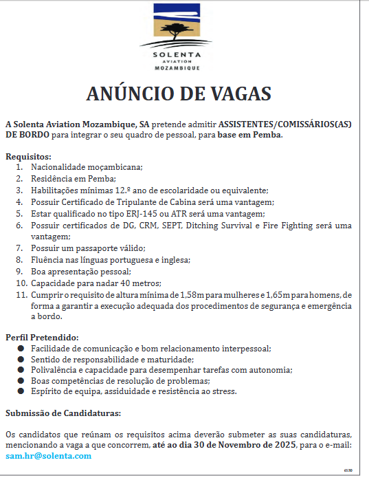 A Solenta Aviation Mozambique, SA pretende admitir ASSISTENTES/COMISSARIOS(AS) DE BORDO para integrar o seu quadro de pessoal, para base em Pemba.