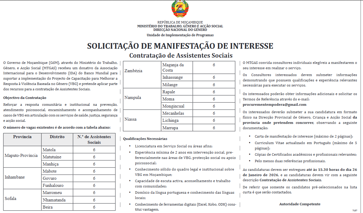 O Governo de Moçambique (GdM), através do Ministério do Trabalho, Género, e Acção Social (MTGAS) recebeu um donativo da Associação Internacional para o Desenvolvimento (IDA) do Banco Mundial para suportar a implementação do Projecto de Capacitação para Melhorar a Resposta à Violência Baseada no Género (VBG) e pretende aplicar parte dos recursos para a contratação de Assistentes Sociais.