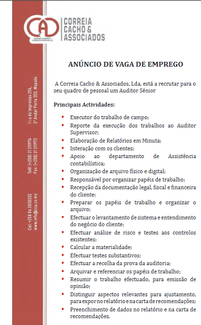 A Correia Cacho & Associados, Lda, está a recrutar para o seu quadro de pessoal um Auditor Sénior