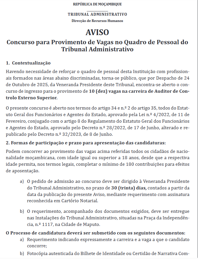Havendo necessidade de reforçar o quadro de pessoal desta Instituição com profission- ais formados nas áreas abaixo discriminadas, torna-se público, que por Despacho de 24 de Outubro de 2025, da Veneranda Presidente deste Tribunal, encontra-se aberto o concurso de ingresso para o provimento de 10 (dez) vagas na carreira de Auditor de Controlo Externo Superior.