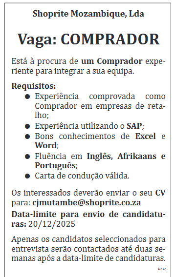 Os interessados deverao enviar o seu CV para: cjmutambe@shoprite.co.za
