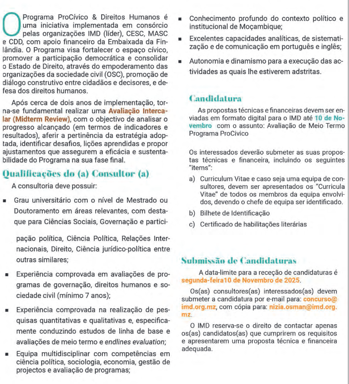 - Conhecimento profundo do contexto político e institucional de Moçambique;