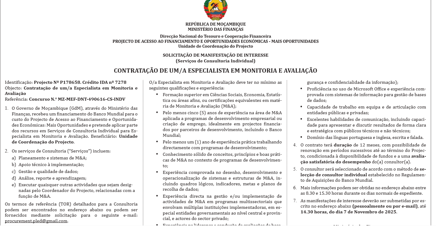 O Ministério das Finanças (MF) convida os consultores individuais elegíveis para submeter a sua manifestação de interesse para a posição de Especialista em Monitoria e Avaliação. Os consultores interessados devem fornecer informações que demonstrem que possuem as qualificações exigidas e a experiência relevante para prestar os serviços (CV, experiência de trabalho em condições similares, certificados, disponibilidade, etc.).