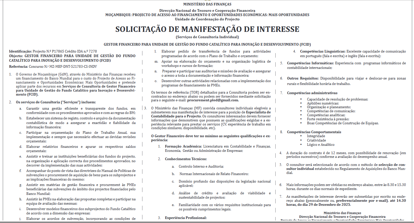 O Governo de Moçambique (GdM), através do Ministério das Finanças recebeu um financiamento do Banco Mundial para o custo do Projecto de Acesso ao Financiamento e Oportunidades Económicas: Mais Oportunidades e pretende aplicar parte dos recursos em Serviços de Consultoria de Gestor Financeiro para Unidade de Gestão do Fundo Catalítico para Inovação e Desenvolvi- mento (FCID).