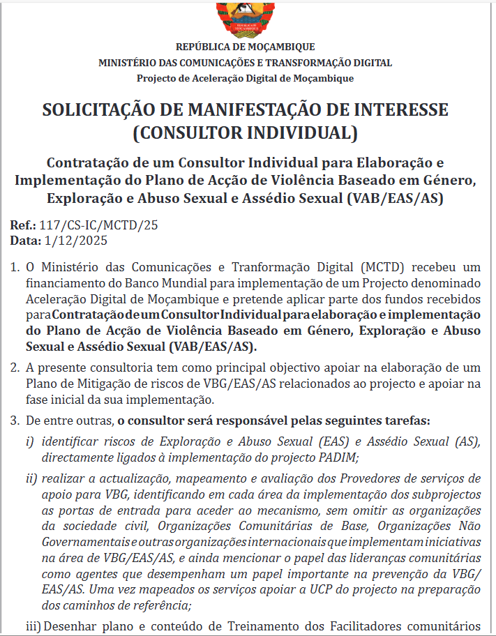 O Ministério das Comunicações e Transformação Digital (MCTD) recebeu um financiamento do Banco Mundial para implementação de um Projecto denominado Aceleração Digital de Moçambique e pretende aplicar parte dos fundos recebidos para Contratação de um Consultor Individual para elaboração e implementação do Plano de Acção de Violência Baseado em Género, Exploração e Abuso Sexual e Assédio Sexual (VAB/EAS/AS).