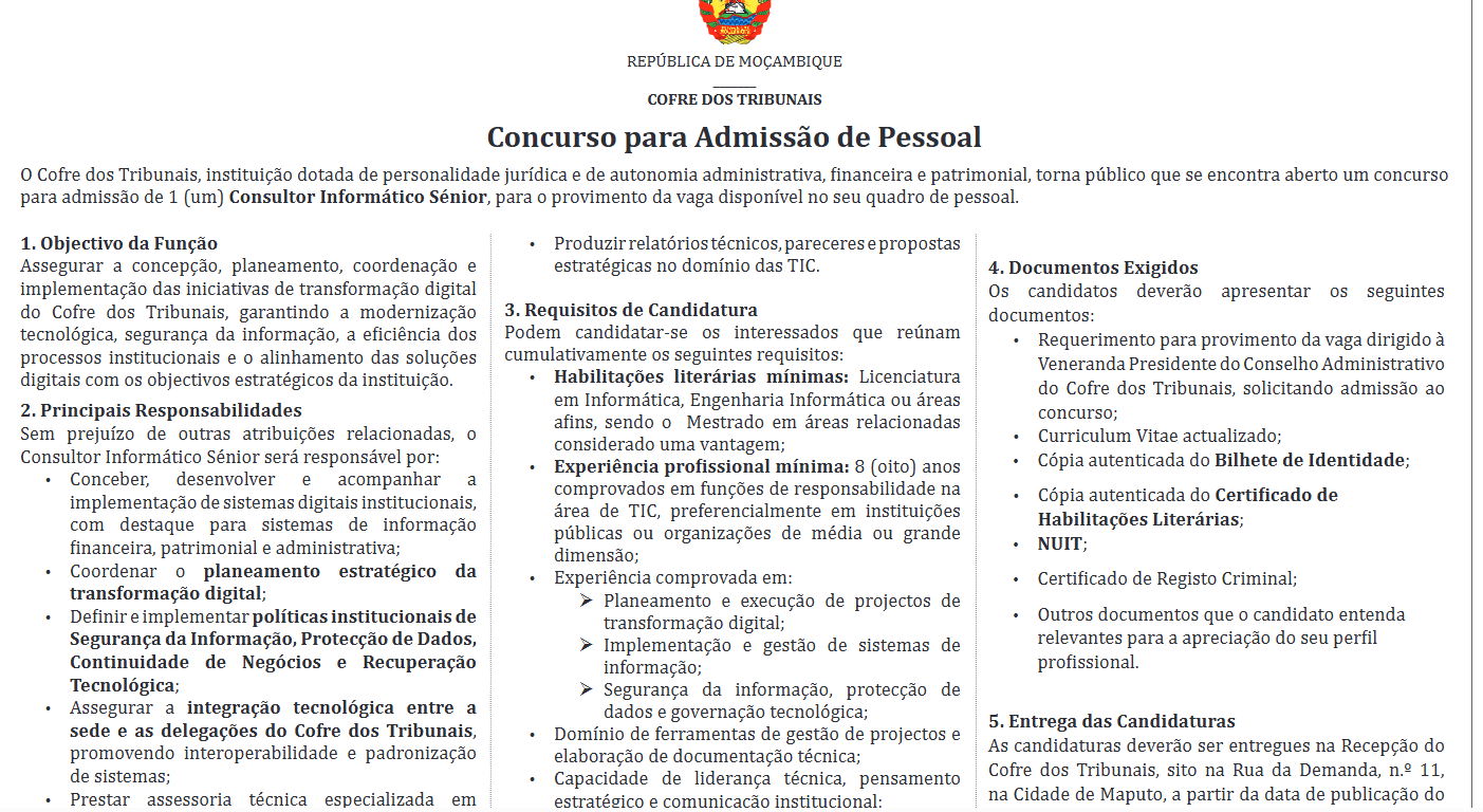 O Cofre dos Tribunais, instituição dotada de personalidade jurídica e de autonomia administrativa, financeira e patrimonial, torna público que se encontra aberto um concurso para admissão de 1 (um) Consultor Informático Sénior, para o provimento da vaga disponível no seu quadro de pessoal.