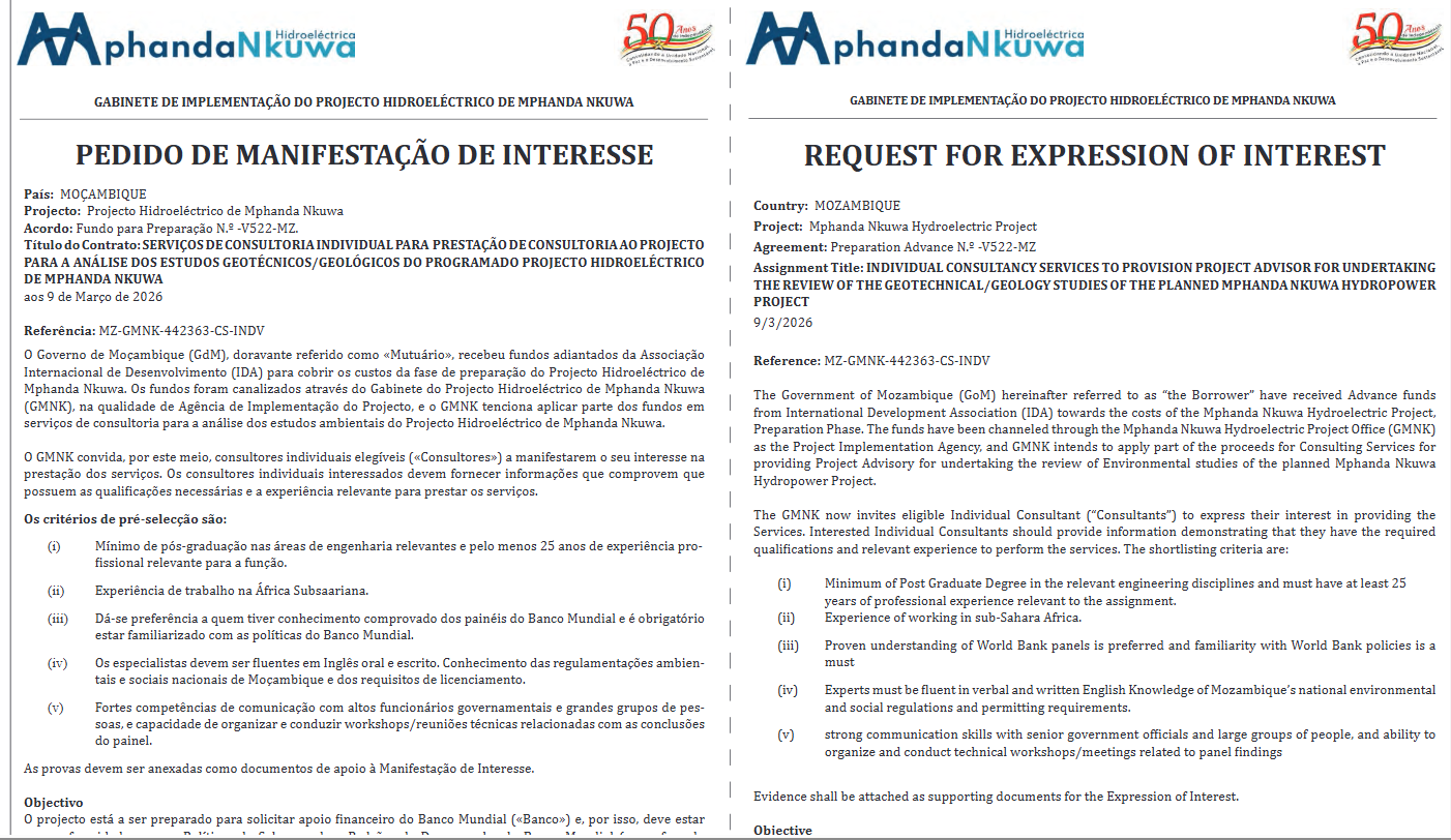 O Governo de Moçambique (GdM), doravante referido como «Mutuário», recebeu fundos adiantados da Associação Internacional de Desenvolvimento (IDA) para cobrir os custos da fase de preparação do Projecto Hidroelétrico de Mphanda Nkuwa. Os fundos foram canalizados através do Gabinete do Projecto Hidroelétrico de Mphanda Nkuwa (GMNK), na qualidade de Agência de Implementação do Projecto, e o GMNK tenciona aplicar parte dos fundos em serviços de consultoria para a análise dos estudos ambientais do Projecto Hidroelétrico de Mphanda Nkuwa.