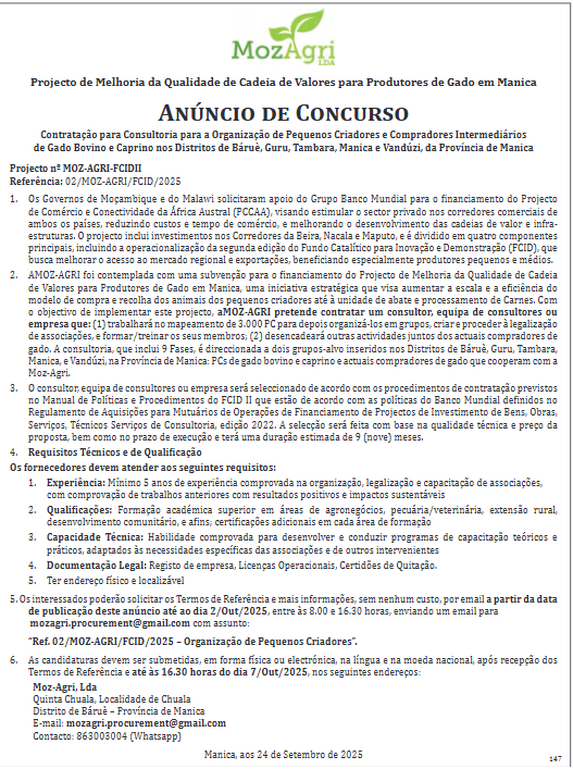 Os interessados poderão solicitar os Termos de Referencia e mais informações, sem nenhum custo, por email a partir da data de publicação deste anuncio ate ao dia 2/Out/2025, entre as 8.00 e 16.30 horas, enviando um email para mozagri.procurement@gmail.com com assunto: “Ref. 02/MOZ-AGRI/FCID/2025 – Organização de Pequenos Criadores”.