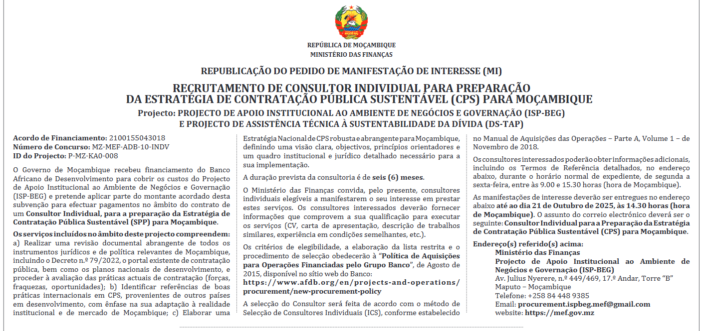 As manifestações de interesse deverão ser entregues no endereço abaixo até ao dia 21 de Outubro de 2025, às 14.30 horas (hora de Moçambique). O assunto do correio eletrónico deverá ser o seguinte: Consultor Individual para a Preparação da Estratégia de Contratação Pública Sustentável (CPS) para Moçambique.