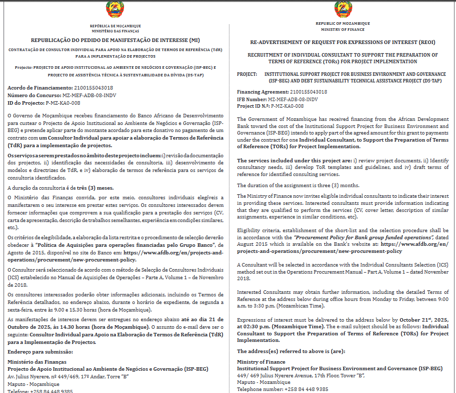 O Governo de Moçambique recebeu financiamento do Banco Africano de Desenvolvimento para custear o Projecto de Apoio Institucional ao Ambiente de Negócios e Governação (ISP-BEG) e pretende aplicar parte do montante acordado para este donativo no pagamento de um contrato com um Consultor Individual para apoiar a elaboração de Termos de Referência (TdR) para a implementação de projectos.