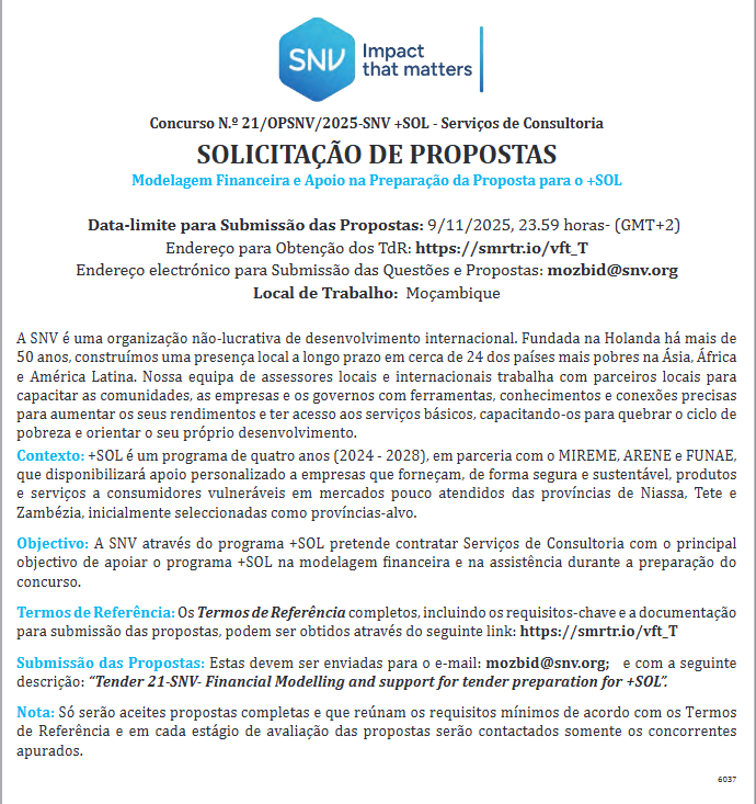 Submissao das Propostas: Estas devem ser enviadas para o e-mail: mozbid@snv.org; e com a seguinte descricao: “Tender 21-SNV- Financial Modelling and support for tender preparation for +SOL”.
