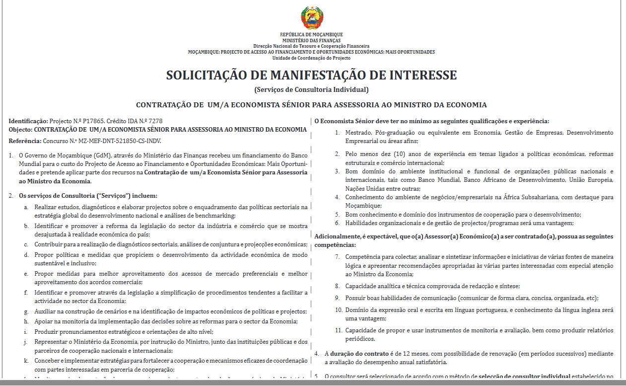 O Governo de Moçambique (GdM), através do Ministério das Finanças recebeu um financiamento do Banco Mundial para o custo do Projecto de Acesso ao Financiamento e Oportunidades Económicas: Mais Oportunidades e pretende aplicar parte dos recursos na Contratação de um/a Economista Sénior para Assessoria ao Ministro da Economia.