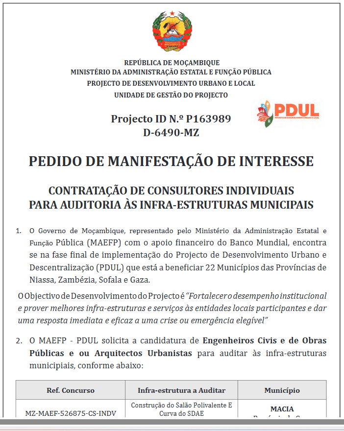 O MAEFP – PDUL solicita a candidatura de Engenheiros Civis e de Obras Públicas e ou Arquitectos Urbanistas para auditar às infraestruturas municipais, conforme abaixo: