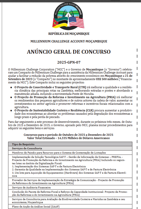 As aquisições estão abertas a todos os proponentes de todos os países elegíveis, tal como definido nas Directrizes de Aquisição do Programa MCC. Os anúncios de concursos específicos para os contratos a concurso serão anunciados, à medida que estiverem disponíveis, no dgMarket (http://www.dgma-rket.com), no website do Ministério da Economia e Finanças de Moçambique (www.mef.govmz) e noutros meios de comunicação social. Os contratantes e consultores elegíveis interessados que desejem ser incluídos na lista de endereços para receberem uma cópia dos anúncios de concursos específicos devem registar-se através de