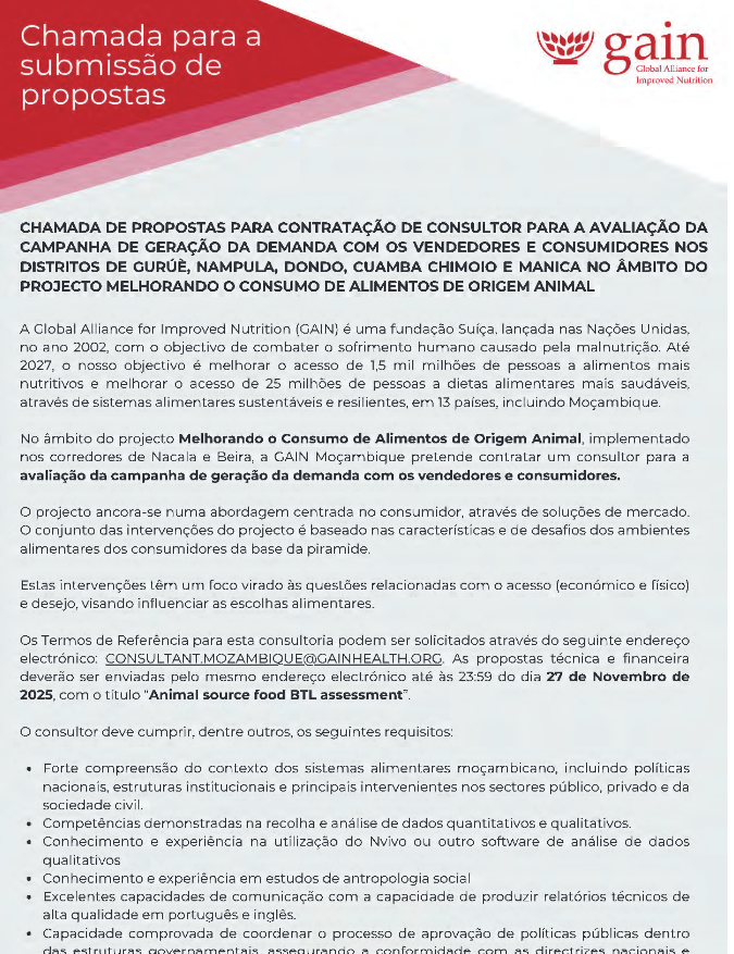 No âmbito do projecto Melhorando o Consumo de Alimentos de Origem Animal, implementado nos corredores de Nacala e Beira, a GAIN Moçambique pretende contratar um consultor para a avaliação da campanha de geração da demanda com os vendedores e consumidores.