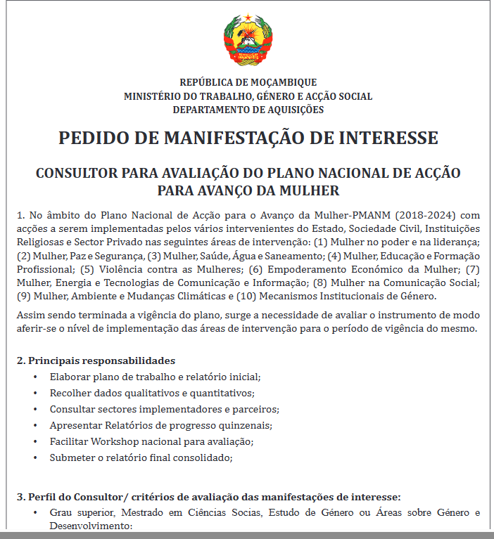 - Mínimo de 10 anos de Experiência em Políticas Publicas de Género e de liderar equipa de Monitoria e Avaliação;