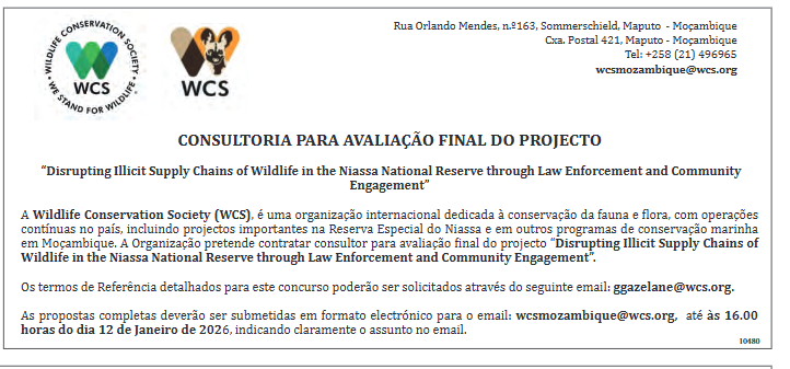 A Wildlife Conservation Society (WCS), e uma organização internacional dedicada à conservação da fauna e flora, com operações continuas no país, incluindo projectos importantes na Reserva Especial do Niassa e em outros programas de conservação marinha em Moçambique. A Organização pretende contratar consultor para avaliação final do projecto “Disrupting Illicit Supply Chains of Wildlife in the Niassa National Reserve through Law Enforcement and Community Engagement”.