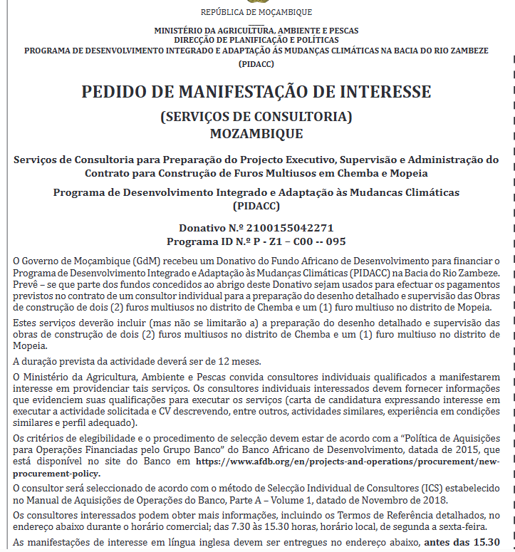 Serviços de Consultoria para Preparação do Projecto Executivo, Supervisão e Administração do Contrato para Construção de Furos Multiusos em Chemba e Mopeia Programa de Desenvolvimento Integrado e Adaptação as Mudanças Climáticas (PIDACC)