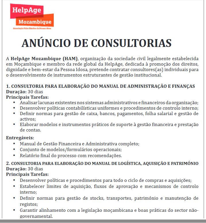 A HelpAge Mozambique (HAM), organização da sociedade civil legalmente estabelecida em Moçambique e membro da rede global da HelpAge, dedicada à promoção dos direitos, dignidade e bem-estar da Pessoa Idosa, pretende contratar consultores(as) individuais para o desenvolvimento de instrumentos estruturantes de gestão institucional.