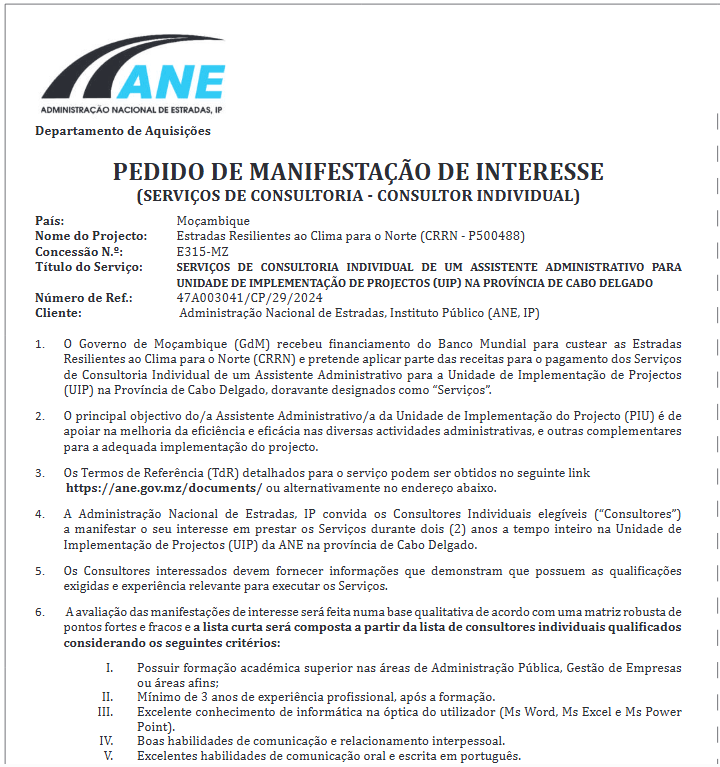 A Administração Nacional de Estradas, IP convida os Consultores Individuais elegíveis (“Consultores”) a manifestar o seu interesse em prestar os Serviços durante dois (2) anos a tempo inteiro na Unidade de Implementação de Projectos (UIP) da ANE na província de Cabo Delgado.
