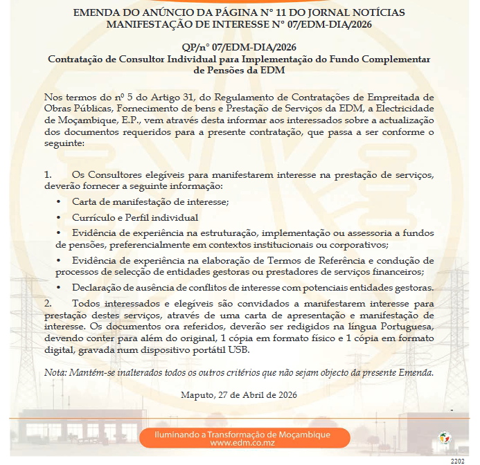 Nos termos do n° 5 do Artigo 31, do Regulamento de Contratações de Empreitada de Obras Publicas, Fornecimento de bens e Prestação de Serviços da EDM, a Eletricidade de Moçambique, E.P., vem através desta informar aos interessados sobre a actualizaçãobdos documentos requeridos para a presente contratação, que passa a ser conforme o seguinte: