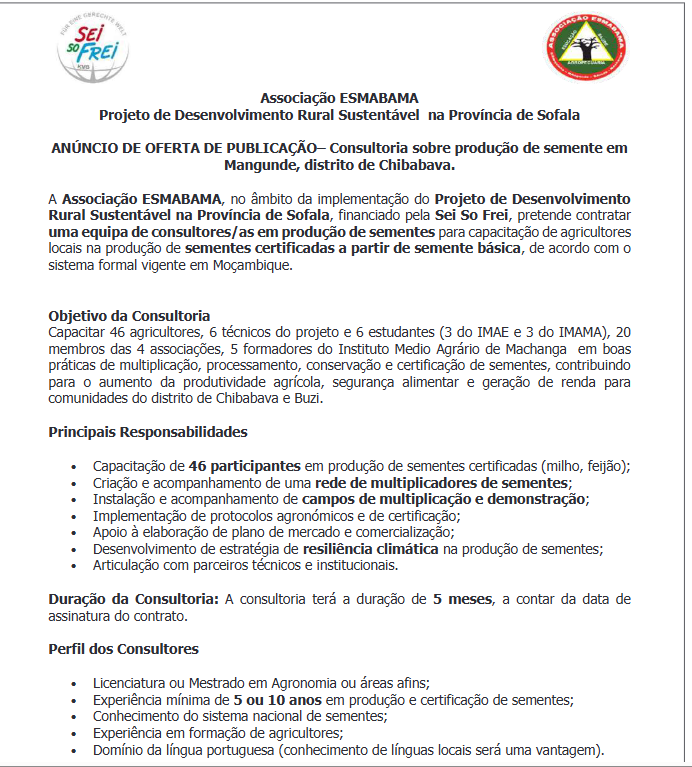 A Associação ESMABAMA, no âmbito da implementação do Projeto de Desenvolvimento Rural Sustentável na Província de Sofala, financiado pela Sei Só Frei, pretende contratar uma equipa de consultores/as em produção de sementes para capacitação de agricultores locais na produção de sementes certificadas a partir de semente básica, de acordo com o sistema formal vigente em Moçambique.