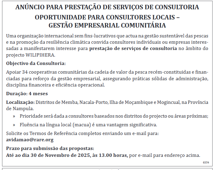 Uma organização internacional sem fins lucrativos que actua na gestão sustentável das pescas e na promoção da resiliência climática convida consultores individuais ou empresas interessadas a manifestarem interesse para prestação de serviços de consultoria no âmbito do projecto WILIPIHERA.