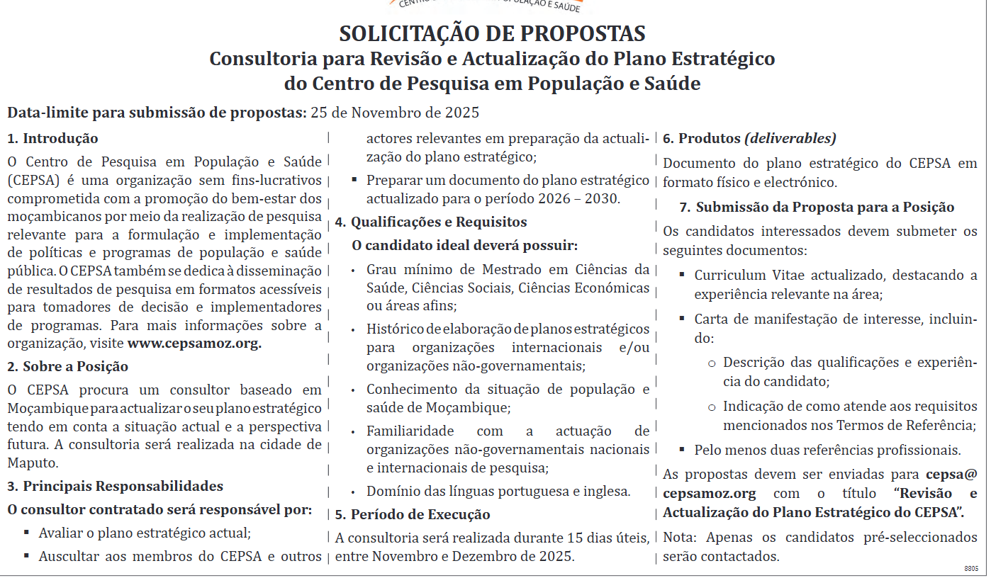 O CEPSA procura um consultor baseado em Moçambique para actualizar o seu plano estratégico tendo em conta a situação actual e a perspectiva l futura. A consultoria será realizada na cidade de Maputo.