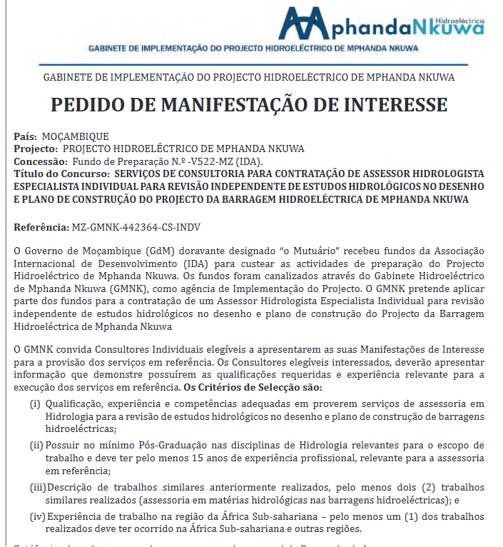 O Governo de Mocambique (GdM) doravante designado “o Mutuário” recebeu fundos da Associação Internacional de Desenvolvimento (IDA) para custear as actividades de preparação do Projecto Hidroelectrico de Mphanda Nkuwa. Os fundos foram canalizados atraves do Gabinete Hidroelectrico de Mphanda Nkuwa (GMNK), como agência de Implementação do Projecto. O GMNK pretende aplicar parte dos fundos para a contratação de um Assessor Hidrologista Especialista Individual para revisão independente de estudos hidrológicos no desenho e plano de construção do Projecto da Barragem Hidroelétrica de Mphanda Nkuwa.