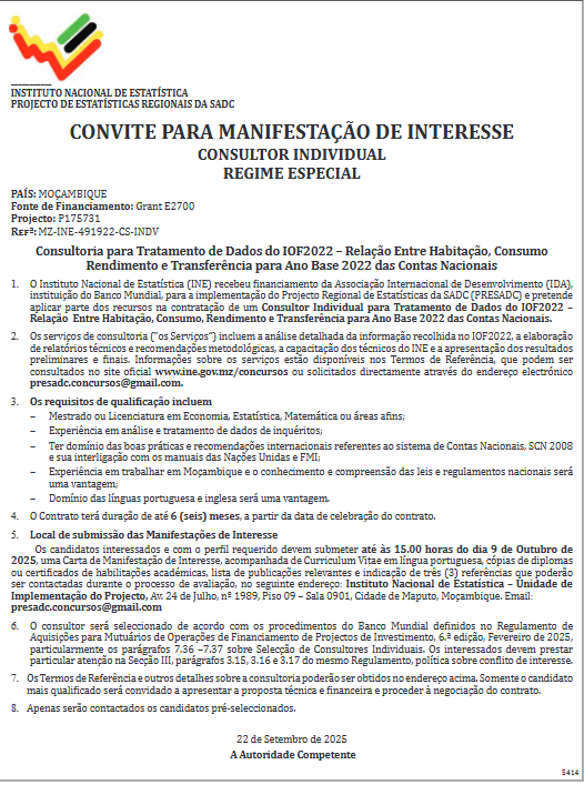 Os candidatos interessados e com o perfil requerido devem submeter ate as 15.00 horas do dia 9 de Outubro de 2025, uma Carta de Manifestação de Interesse, acompanhada de Curriculum Vitae em língua portuguesa, copias de diplomas ou certificados de habilitações académicas, lista de publicações relevantes e indicação de três (3) referencias que poderão ser contactadas durante o processo de avaliação, no seguinte endereço: Instituto Nacional de Estatística – Unidade de Implementação do Projecto, Av. 24 de Julho, nº 1989, Piso 09 – Sala 0901, Cidade de Maputo, Moçambique. Email: presadc.concursos@gmail.com