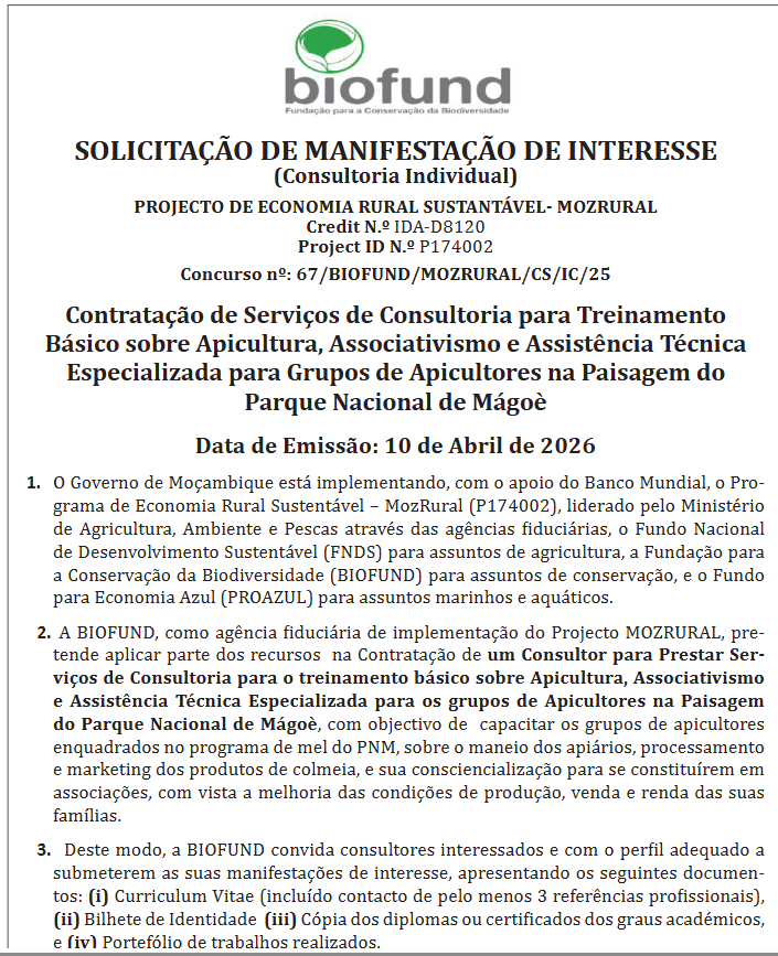 A BIOFUND, como agência fiduciária de implementação do Projecto MOZRURAL, pretende aplicar parte dos recursos na Contratação de um Consultor para Prestar Ser- viços de Consultoria para o treinamento básico sobre Apicultura, Associativismo e Assistência Técnica Especializada para os grupos de Apicultores na Paisagem do Parque Nacional de Mágoè, com objectivo de capacitar os grupos de apicultores enquadrados no programa de mel do PNM, sobre o maneio dos apiários, processamento e marketing dos produtos de colmeia, e sua consciencialização para se constituírem em associações, com vista a melhoria das condições de produção, venda e renda das suas famílias.