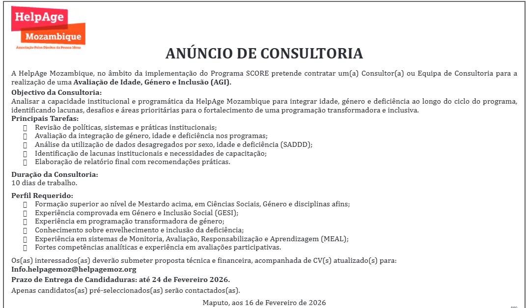 A HelpAge Mozambique, no âmbito da implementação do Programa SCORE pretende contratar um(a) Consultor(a) ou Equipa de Consultoria para a realização de uma Avaliação de Idade, Género e Inclusão (AGI).