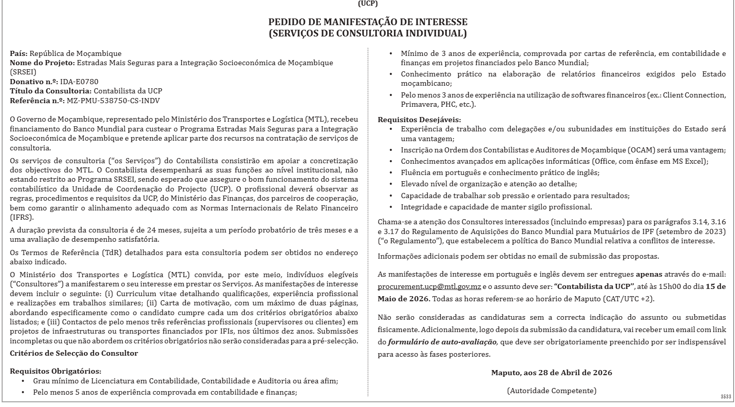 As manifestações de interesse em português e inglês devem ser entregues apenas através do e-mail: procurement.ucp@mtl.gov.mz e o assunto deve ser: “Contabilista da UCP”, até às 15h00 do dia 15 de Maio de 2026. Todas as horas referem-se ao horário de Maputo (CAT/UTC +2).