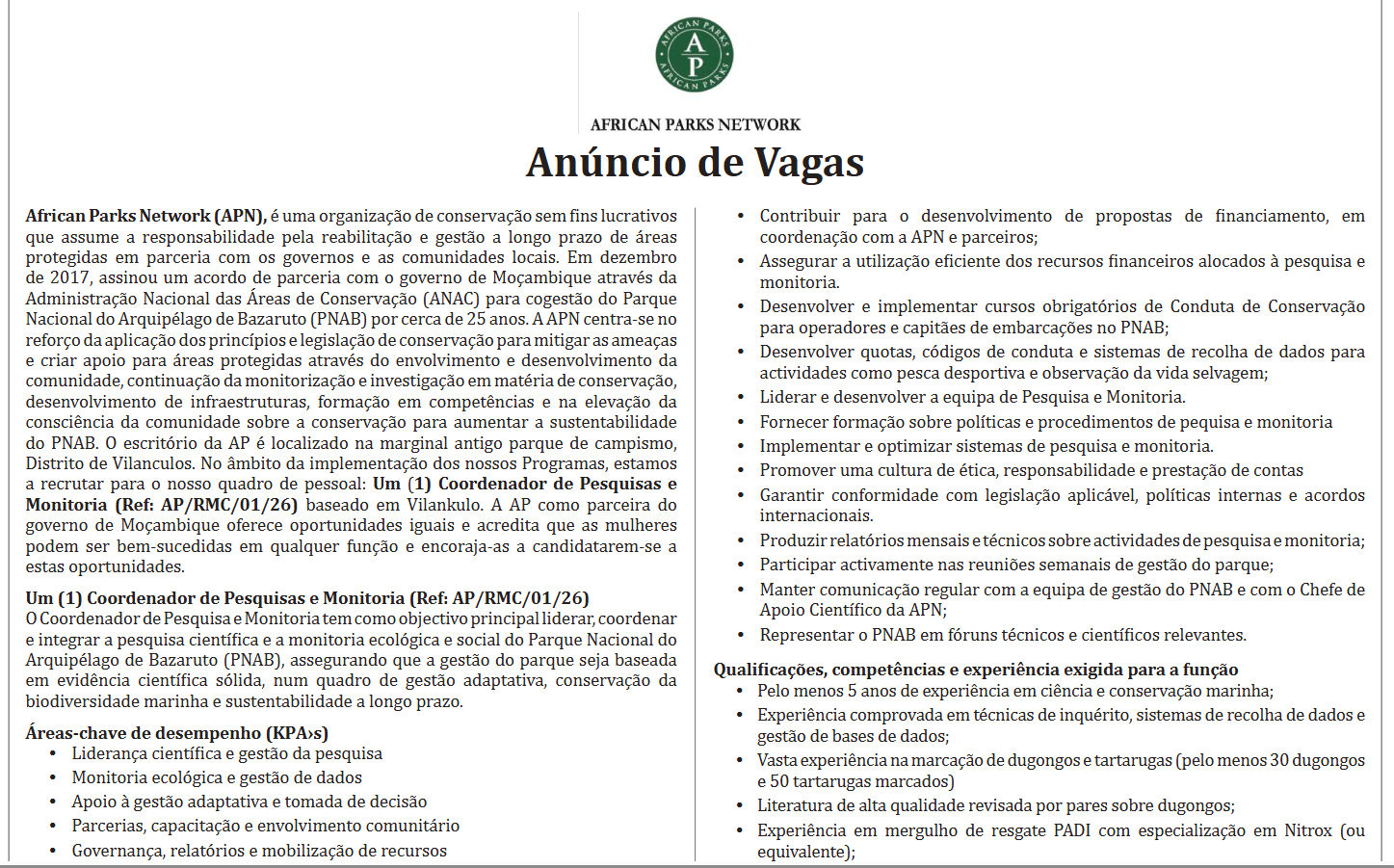 African Parks Network (APN), é uma organização de conservação sem fins lucrativos que assume a responsabilidade pela reabilitação e gestão a longo prazo de áreas protegidas em parceria com os governos e as comunidades locais. Em dezembro de 2017, assinou um acordo de parceria com o governo de Moçambique através da Administração Nacional das Áreas de Conservação (ANAC) para cogestão do Parque Nacional do Arquipélago de Bazaruto (PNAB) por cerca de 25 anos. A APN centra-se no reforço da aplicação dos princípios e legislação de conservação para mitigar as ameaças e criar apoio para áreas protegidas através do envolvimento e desenvolvimento da comunidade, continuação da monitorização e investigação em matéria de conservação, desenvolvimento de infraestruturas, formação em competências e na elevação da consciência da comunidade sobre a conservação para aumentar a sustentabilidade do PNAB. O escritório da AP é localizado na marginal antigo parque de campismo, Distrito de Vilanculos. No âmbito da implementação dos nossos Programas, estamos a recrutar para o nosso quadro de pessoal: Um (1) Coordenador de Pesquisas e Monitoria (Ref: AP/RMC/01/26) baseado em Vilankulo. A AP como parceira do governo de Moçambique oferece oportunidades iguais e acredita que as mulheres podem ser bem-sucedidas em qualquer função e encoraja-as a candidatarem-se a estas oportunidades.