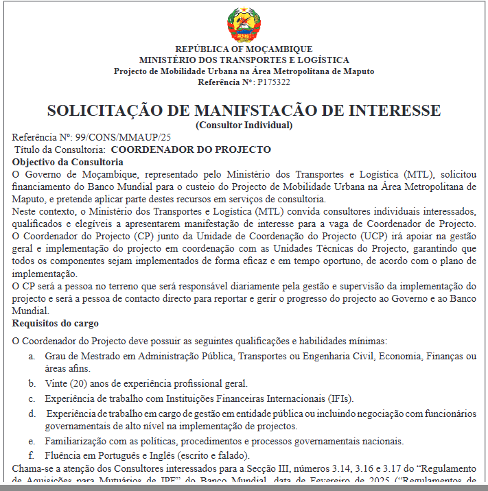 Neste contexto, o Ministério dos Transportes e Logística (MTL) convida consultores individuais interessados, qualificados e elegíveis a apresentarem manifestação de interesse para a vaga de Coordenador de Projecto.