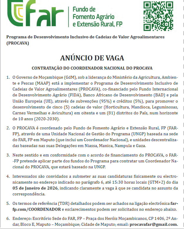 Os termos de referência (TDR) detalhados podem ser achados na ligação eletrónica farfp.com/COORDENADOR e esclarecimentos podem ser solicitados no endereço abaixo. Endereço: Escritório Sede do FAR, FP – Praça dos Heróis Moçambicanos, CP 1406, 2º An-dar, Bloco E, Maputo – Moçambique; Cidade de Maputo; email: procavafar@gmail.com