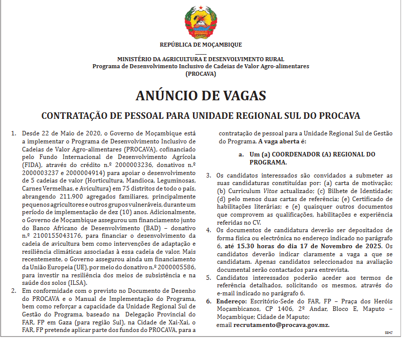 Em conformidade com o previsto no Documento de Desenho do PROCAVA e o Manual de Implementação do Programa, bem como reforçar a capacidade da Unidade Regional Sul de Gestão do Programa, baseado na Delegação Provincial do FAR, FP em Gaza (para região Sul), na Cidade de Xai-Xai, o FAR, FP pretende aplicar parte dos fundos do PROCAVA, para a contratação de pessoal para a Unidade Regional Sul de Gestão do Programa. A vaga aberta é: