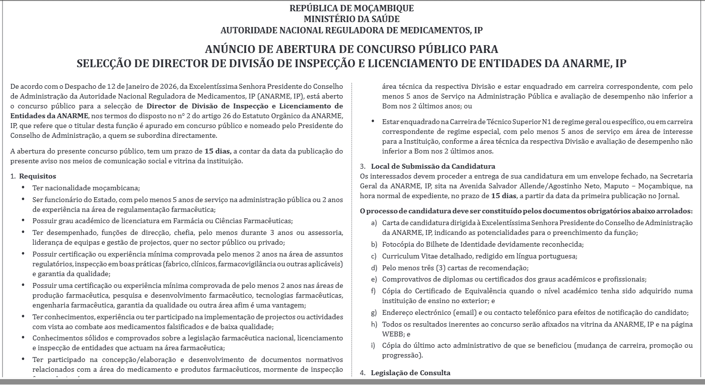 De acordo com o Despacho de 12 de Janeiro de 2026, da Excelentíssima Senhora Presidente do Conselho de Administração da Autoridade Nacional Reguladora de Medicamentos, IP (ANARME, IP), está aberto o concurso público para a selecção de Director de Divisão de Inspecção e Licenciamento de Entidades da ANARME, nos termos do disposto no n° 2 do artigo 26 do Estatuto Orgânico da ANARME, IP, que refere que o titular desta função é apurado em concurso público e nomeado pelo Presidente do Conselho de Administração, a quem se subordina diretamente.