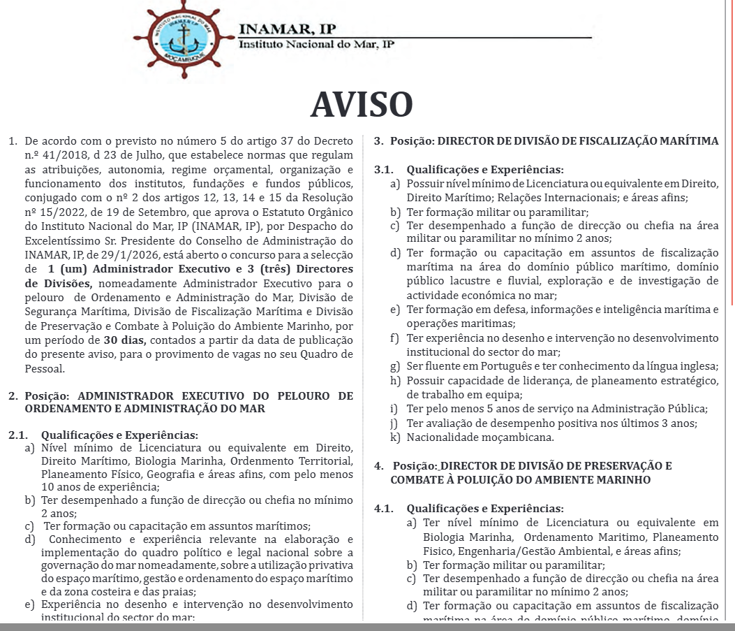 De acordo com o previsto no número 5 do artigo 37 do Decreto n.º 41/2018, d 23 de Julho, que estabelece normas que regulam as atribuições, autonomia, regime orçamental, organização e funcionamento dos institutos, fundações e fundos públicos, conjugado com o nº 2 dos artigos 12, 13, 14 e 15 da Resolução nº 15/2022, de 19 de Setembro, que aprova o Estatuto Orgânico do Instituto Nacional do Mar, IP (INAMAR, IP), por Despacho do Excelentíssimo Sr. Presidente do Conselho de Administração do INAMAR, IP, de 29/1/2026, está aberto o concurso para a selecção de 1 (um) Administrador Executivo e 3 (três) Directores de Divisões, nomeadamente Administrador Executivo para o pelouro de Ordenamento e Administração do Mar, Divisão de Segurança Marítima, Divisão de Fiscalização Marítima e Divisão de Preservação e Combate à Poluição do Ambiente Marinho, por um período de 30 dias, contados a partir da data de publicação do presente aviso, para o provimento de vagas no seu Quadro de Pessoal.