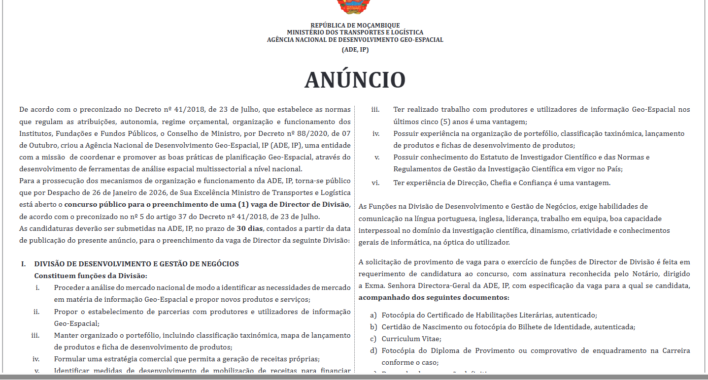 Para a prossecução dos mecanismos de organização e funcionamento da ADE, IP, torna-se público que por Despacho de 26 de Janeiro de 2026, de Sua Excelência Ministro de Transportes e Logística está aberto o concurso público para o preenchimento de uma (1) vaga de Director de Divisão, de acordo com o preconizado no nº 5 do artigo 37 do Decreto nº 41/2018, de 23 de Julho.