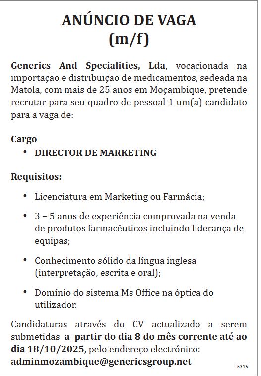 Generics And Specialities, Lda, vocacionada na importação e distribuição de medicamentos, sedeada na Matola, com mais de 25 anos em Moçambique, pretende recrutar para seu quadro de pessoal 1 um(a) candidato para a vaga de: