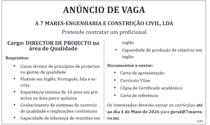 Os Interessados deverão enviar os currículos até ao dia 4 de Maio de 2026 para geral@7mares.co.mz