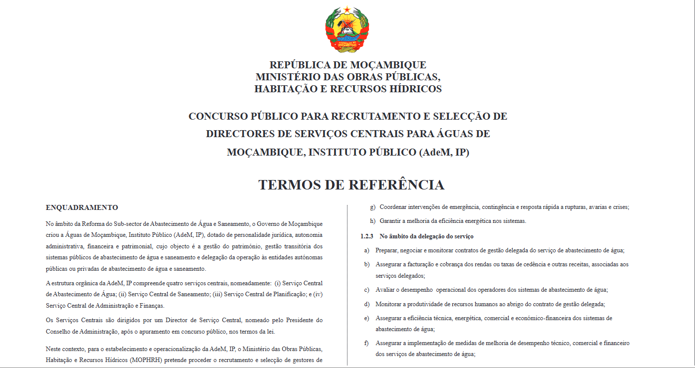 CONCURSO PÚBLICO PARA RECRUTAMENTO E SELECÇÃO DE DIRECTORES DE SERVIÇOS CENTRAIS PARA ÁGUAS DE MOÇAMBIQUE, INSTITUTO PÚBLICO (AdeM, IP)